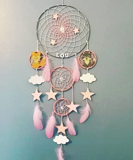 Apportez douceur et magie à a chambre de votre enfant avec l'attrape rêves gris, rose et blanc fait main décoré de nuages, étoiles et de petits animaux.
